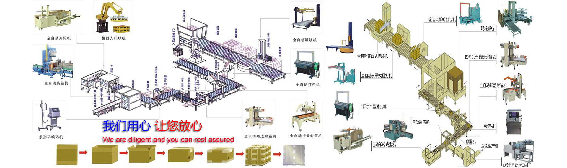 我司可根據(jù)不同產(chǎn)品及要求設(shè)計(jì)定制整條紙箱包裝線,從紙箱成型到最后碼垛纏繞膜包裝。適用于瓶裝,袋裝,罐裝等產(chǎn)品。歡迎來信來電咨詢。